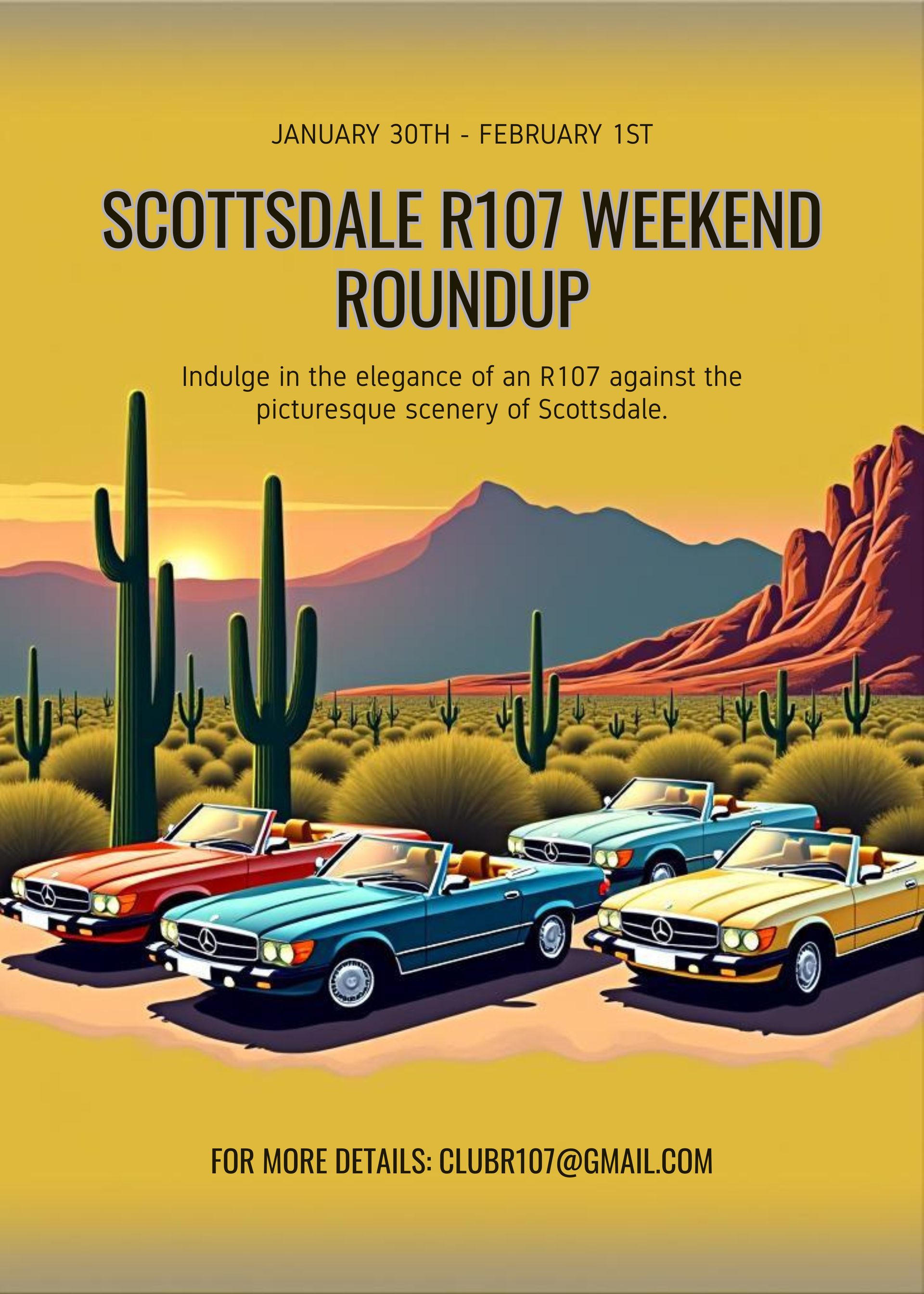 Join us for an exquisite weekend gathering in Scottsdale, where the Mercedes R107s will shine brilliantly beneath the generous Arizona sun, framed by the rugged scenery of the McDowell Mountains. Owners and aficionados will relish a flawless day characterized by clear skies and pleasant temperatures, all while appreciating the timeless elegance of these classic roadsters.